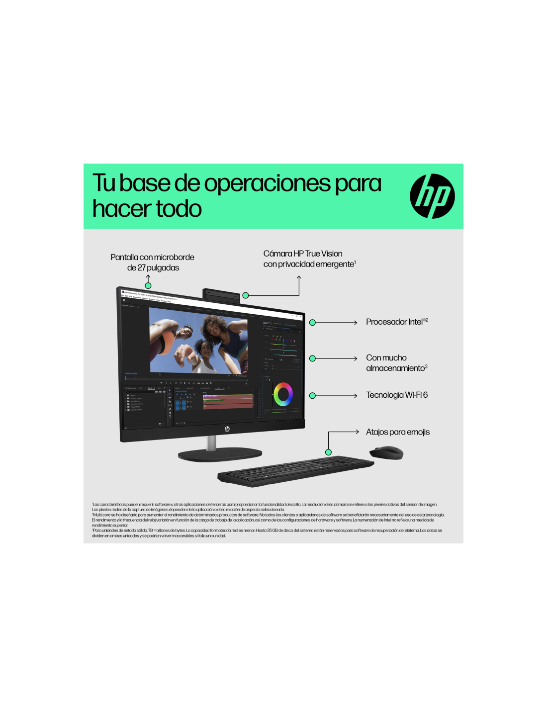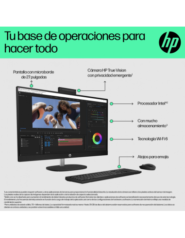 El sobremesa All-in-One HP de 27" te permite hacer más con menos. Fabricado de manera sostenible con plásticos destinados a acabar en los océanos y plásticos reciclados postconsumo[1]. Además, cuenta con certificación EPEAT Gold y ENERGY STAR[2]. Gracias a su potente procesador, la memoria ampliada y las funciones multitarea mejoradas, no tendrás que renunciar a un gran rendimiento.