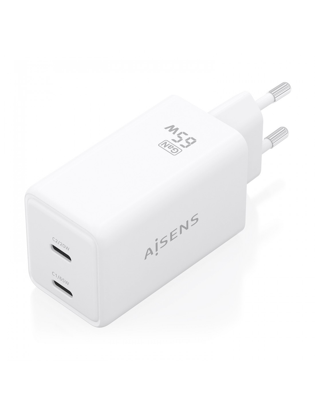AISENS Cargador GaN 65W, 2xUSB-C PD3.0 QC4.0, Blanco, Interior, Corriente alterna, 20 V, Blanco