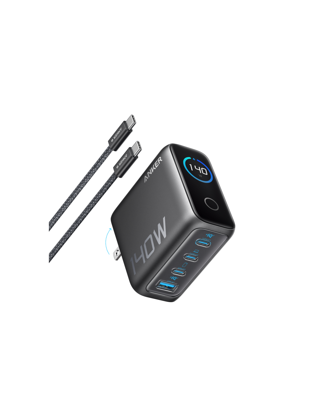 CARGADOR DE PARED ANKER 140W 4 PUERTOS PD 3.1 CON CABLE USB-C NEGRO