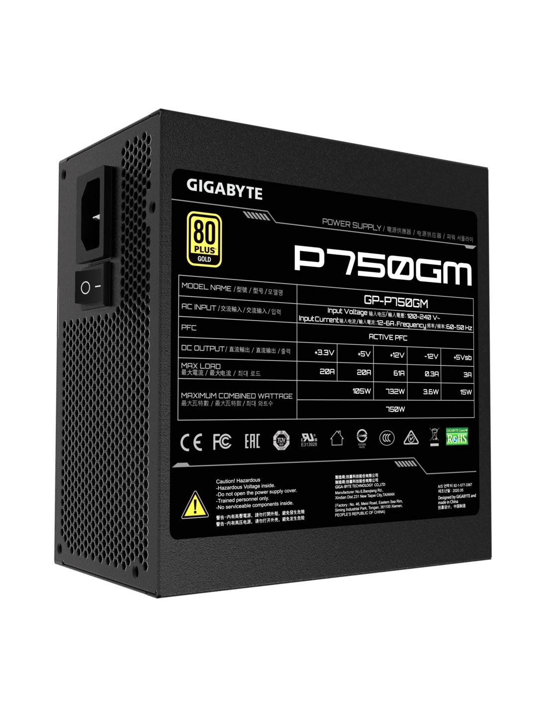 GIGABYTE P750GM, 750 W, 100 - 240 V, 50 - 60 Hz, 12 - 6 A, Activo, 105 W