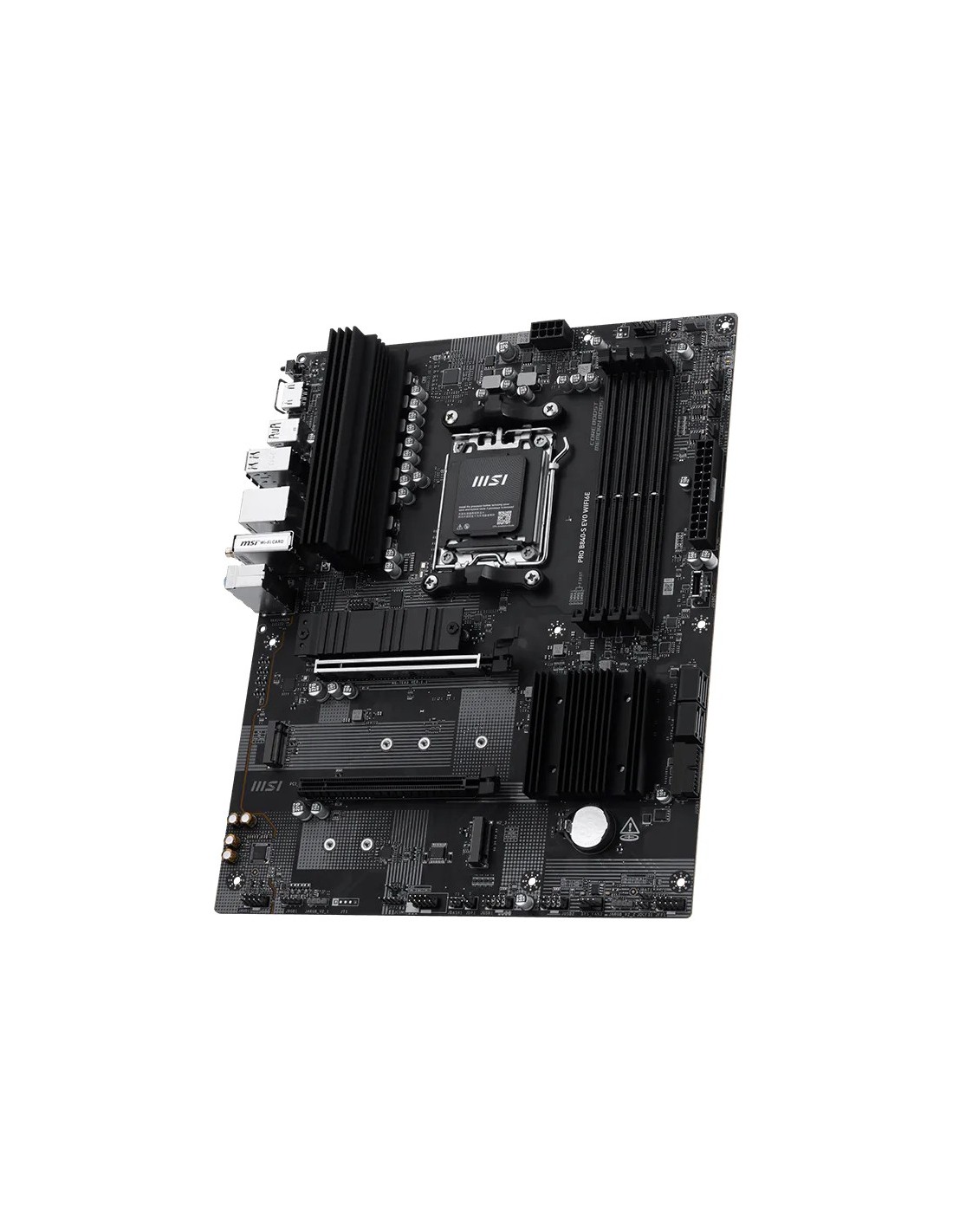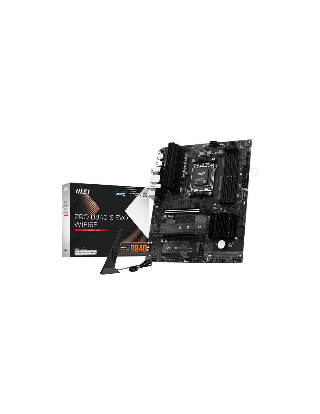 MSI Pro B840-S EVO WIFI6E. Fabricante de procesador: AMD, Socket de procesador: Zócalo AM5, Procesador compatible: AMD Ryzen 7000 Series, AMD Ryzen 8000 Series, AMD Ryzen 9000 Series. tipos de memoria compatibles: DDR5-SDRAM, Memoria interna máxima: 256 GB, Tipo de ranuras de memoria: DIMM. Interfaces de disco de almacenamiento soportados: M.2, Micro SATA III, Tipos de unidades de almacenamiento admitidas: HDD & SSD, Niveles RAID: 0, 1, 10. Componente para: PC, Factor de forma: ATX, Familia del chipset: AMD. Tipos de BIOS: UEFI AMI