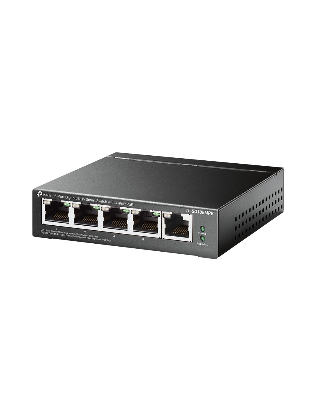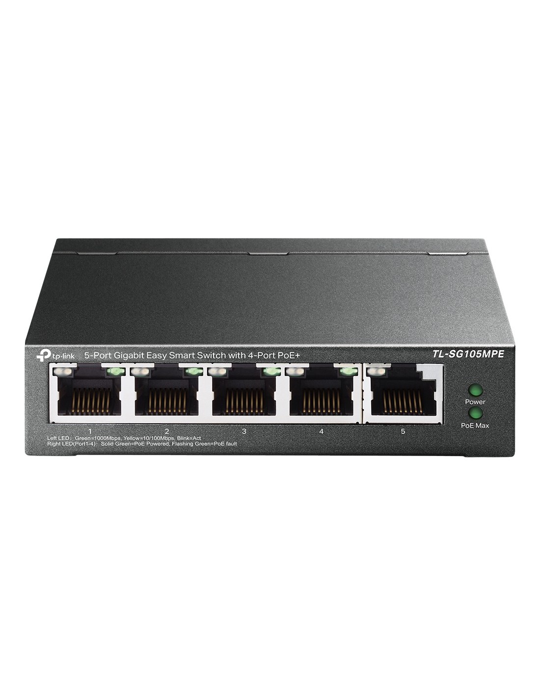 TP-Link TL-SG105MPE. Capa del interruptor: L2. Puertos tipo básico de conmutación RJ-45 Ethernet: Gigabit Ethernet (10/100/1000), Cantidad de puertos básicos de conmutación RJ-45 Ethernet: 5. Tabla de direcciones MAC: 2000 entradas, Capacidad de conmutación: 10 Gbit/s. Estándares de red: IEEE 802.1Q, IEEE 802.1p, IEEE 802.3ab, IEEE 802.3af, IEEE 802.3at, IEEE 802.3i, IEEE 802.3u, IEEE.... Voltaje de entrada DC: 53.5 V. Energía sobre Ethernet (PoE)